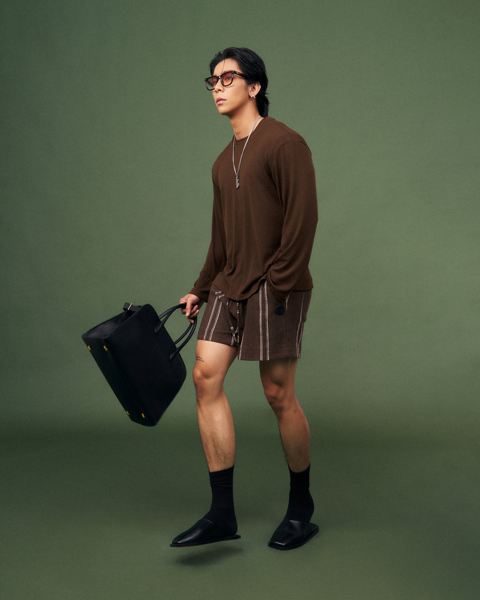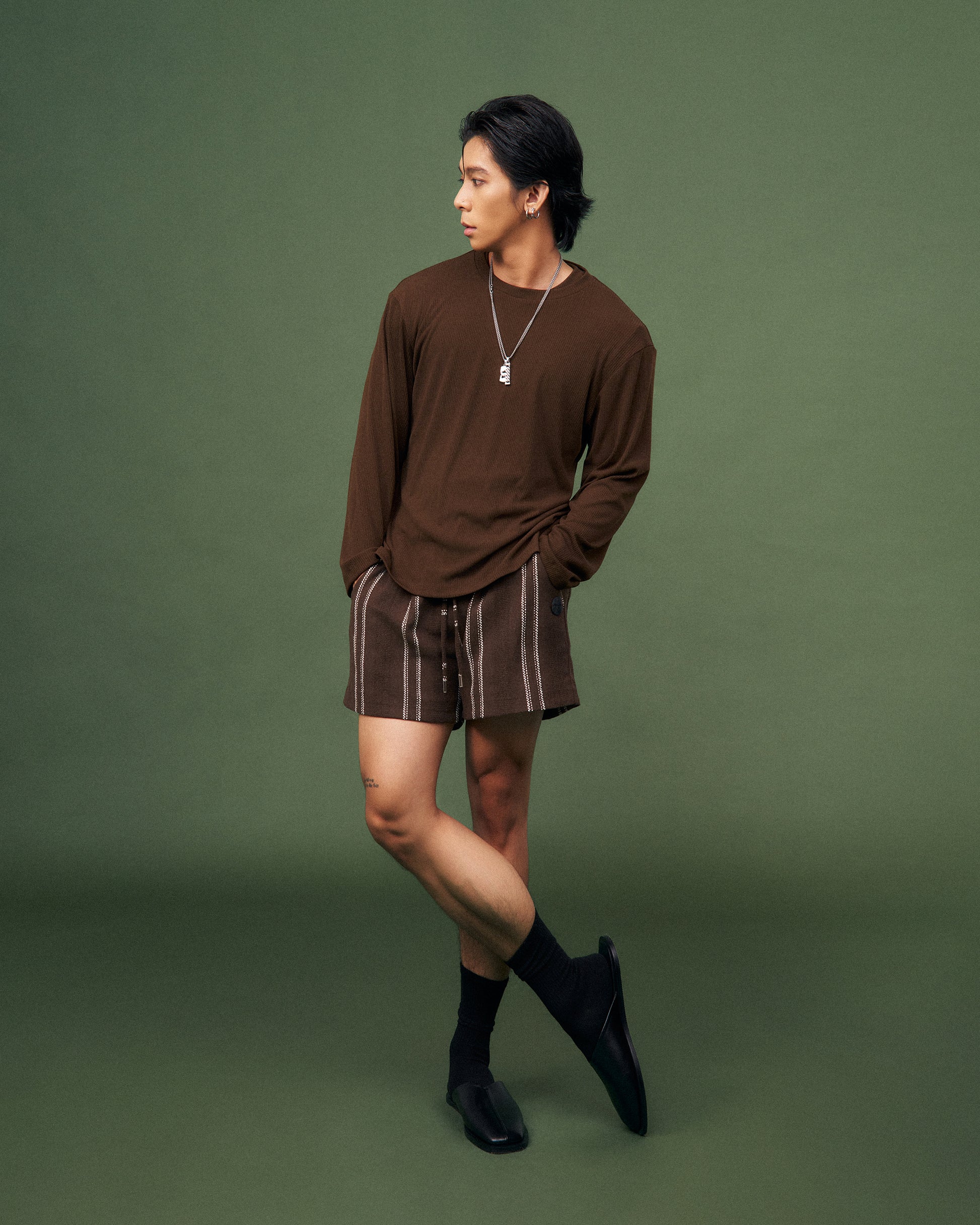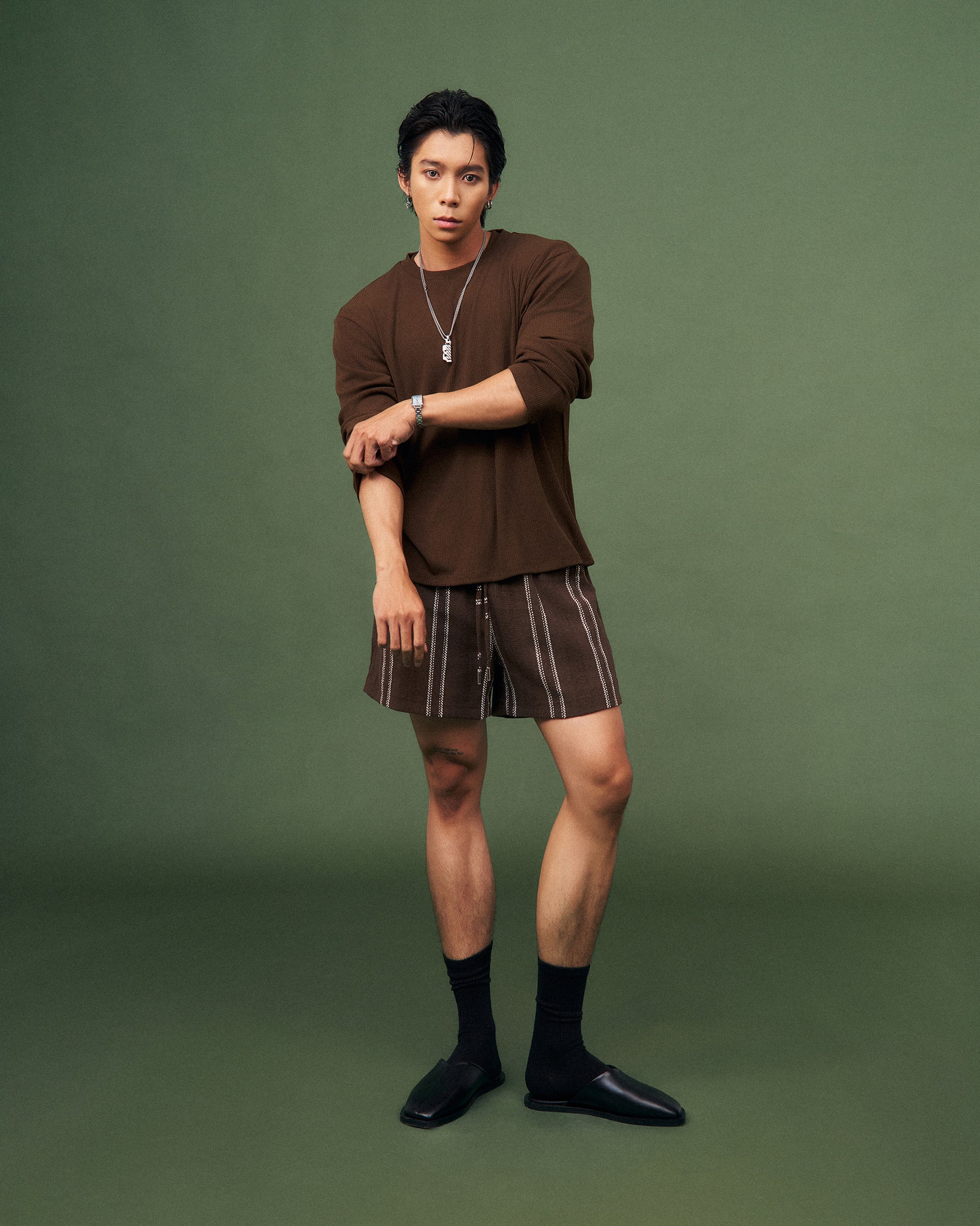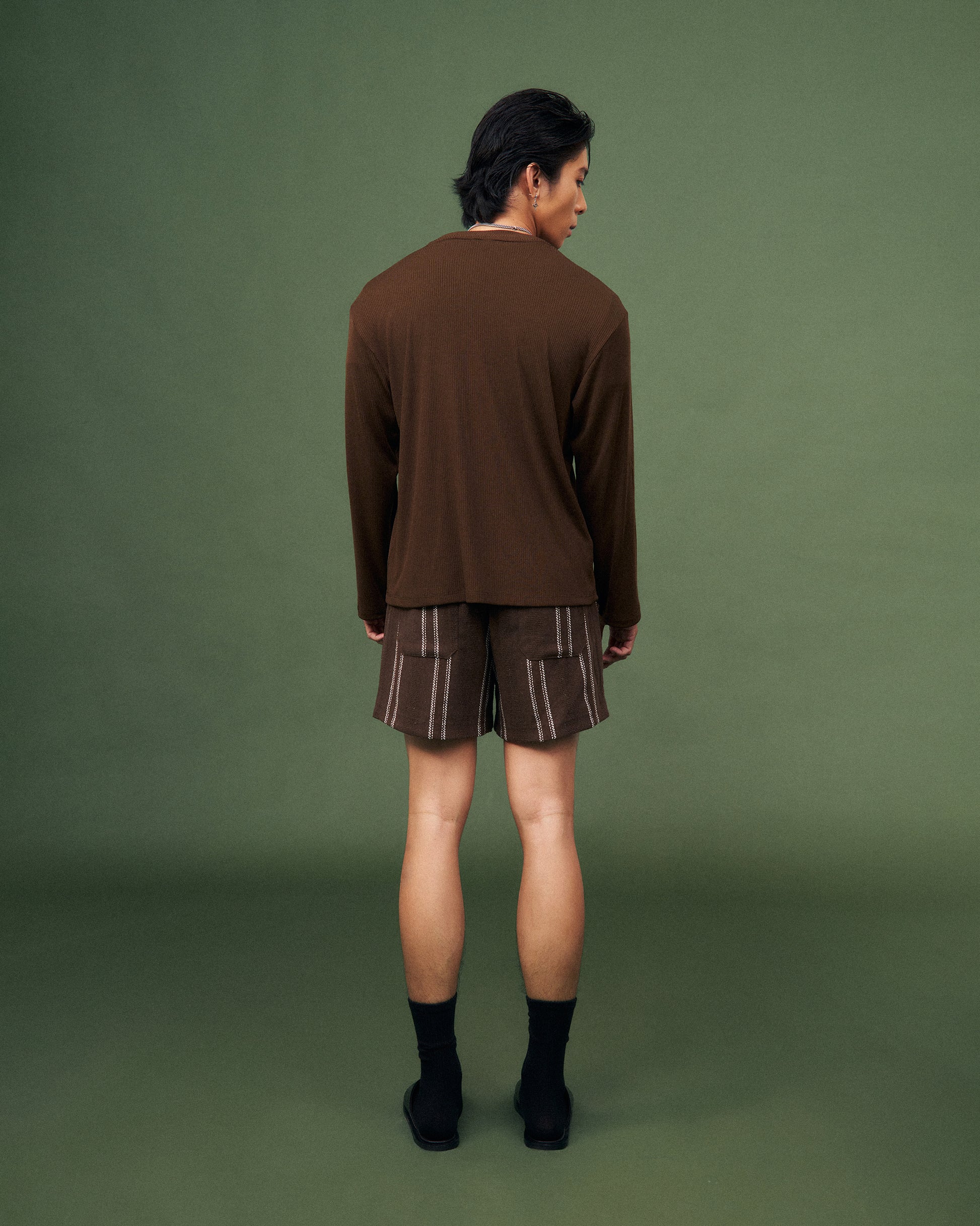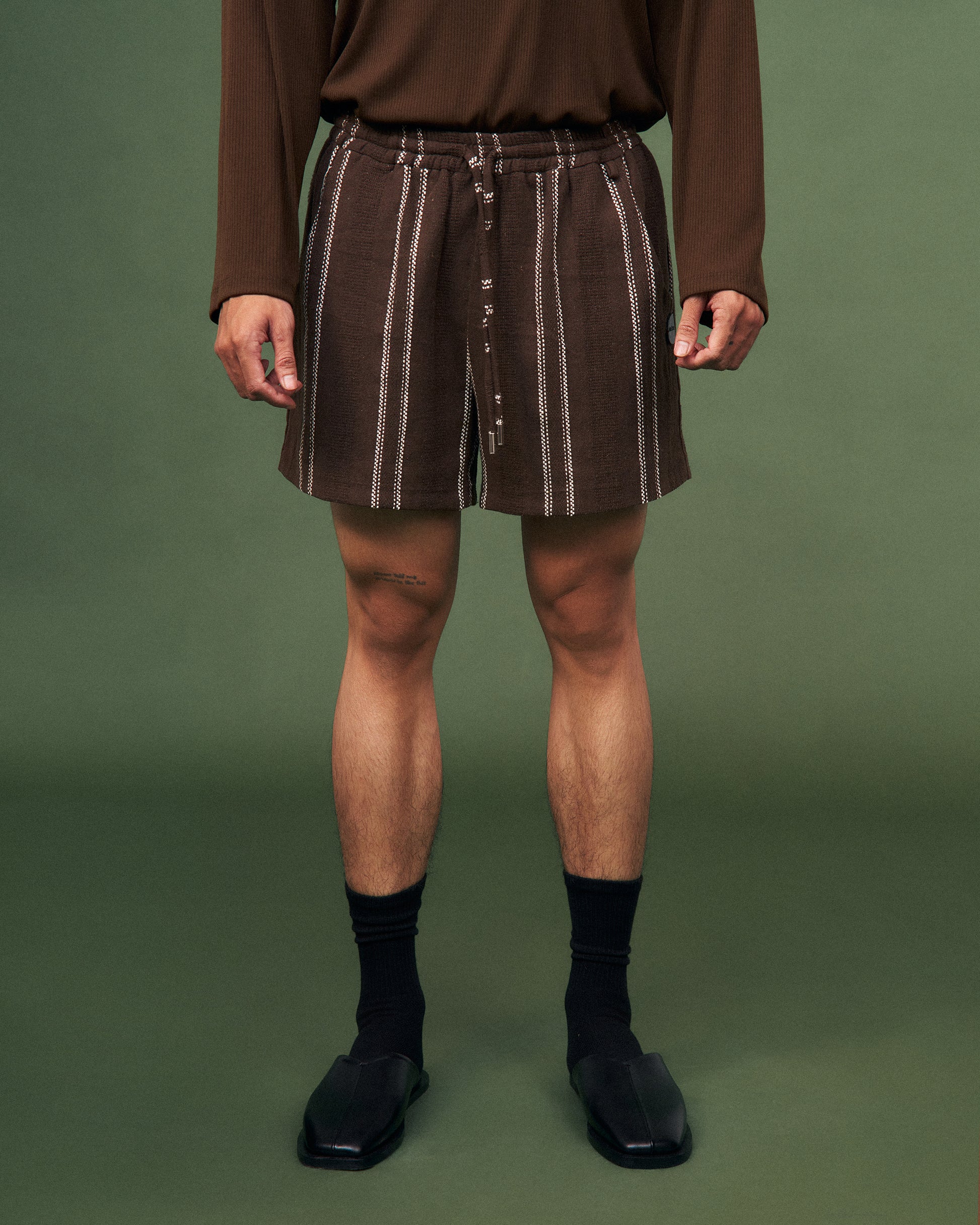Quần shorts nâu kẻ sọc nam dáng suông dây rút